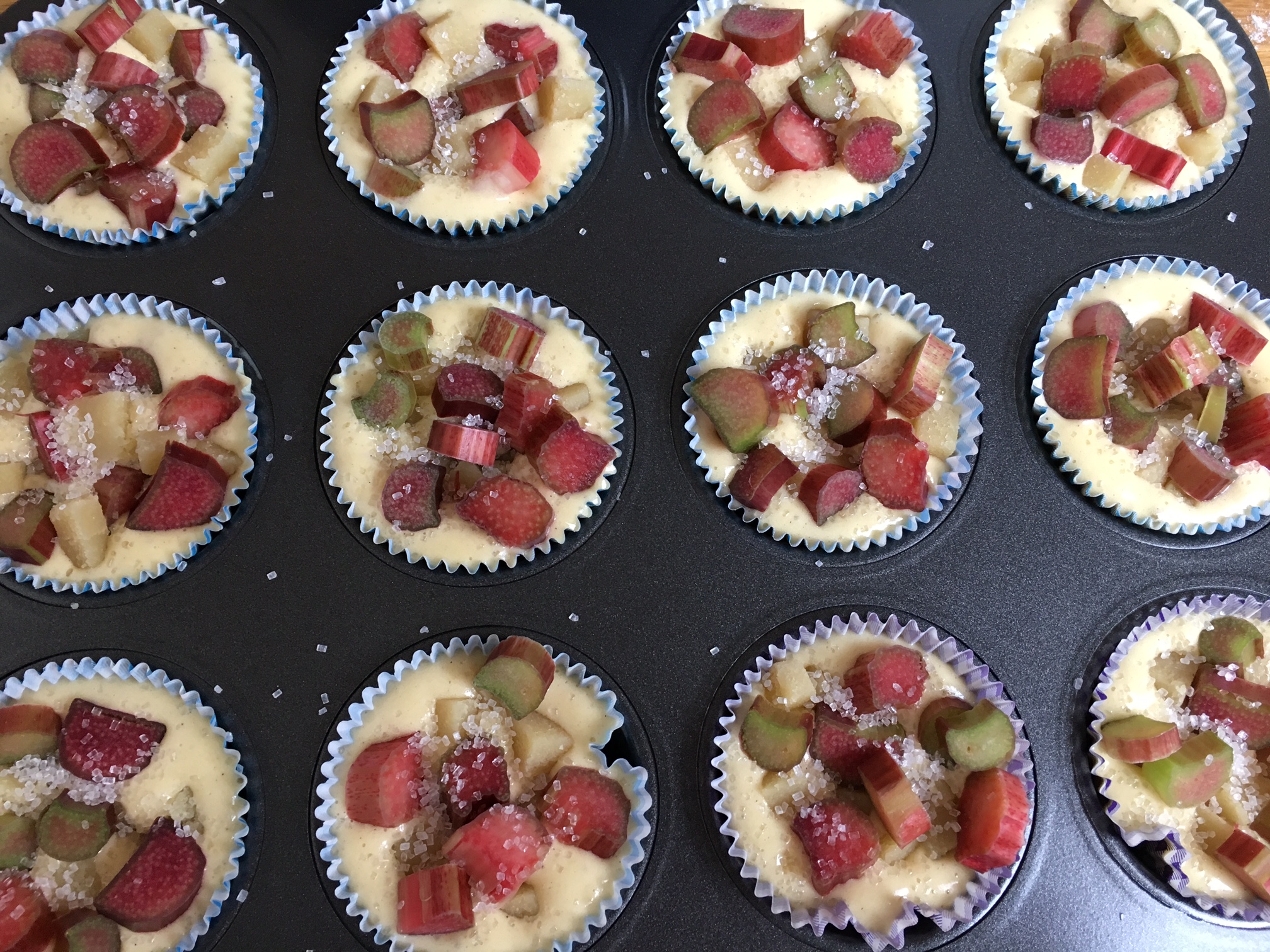Stop marcipan- og rabarberstykker ned i hver muffin. Drys med perlesukker på toppen.