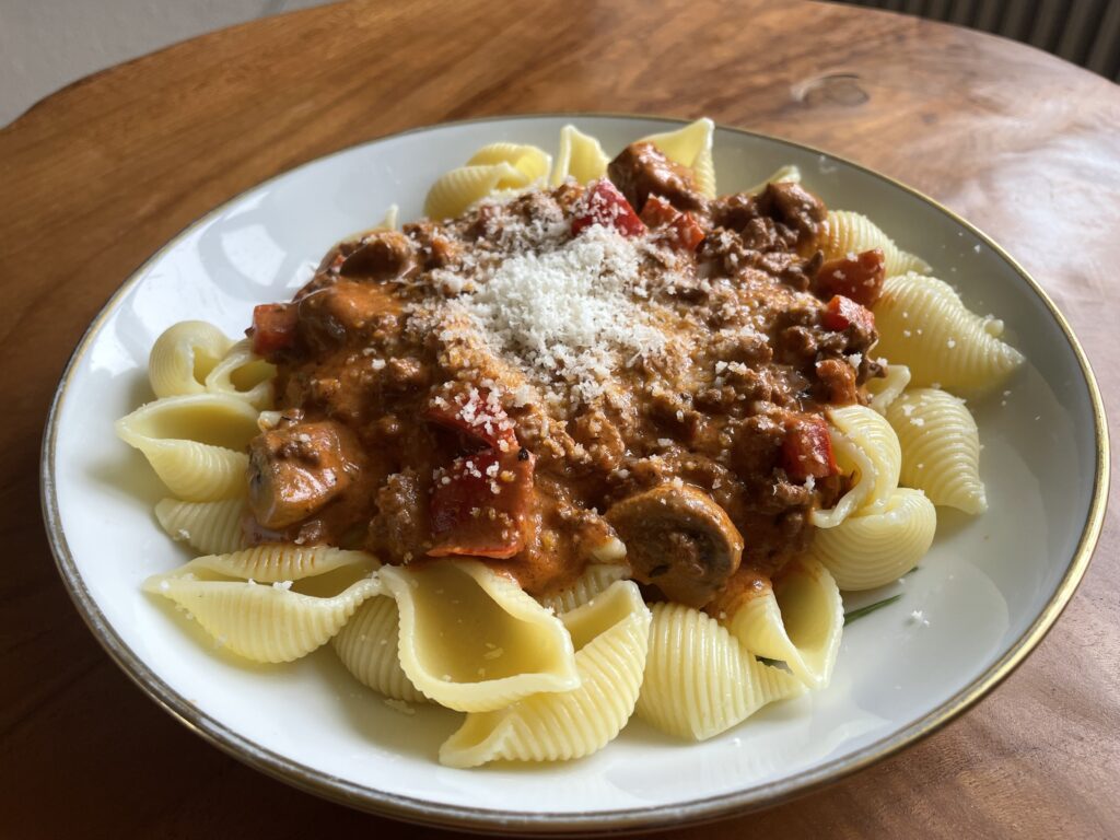 - Ca. 15 minutter før servering: Tilsæt de stegte champignon og peberfrugt.